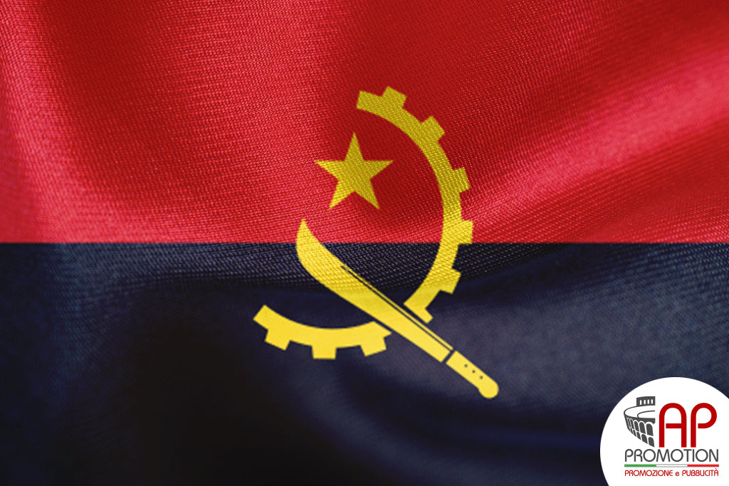 Bandiera nazionale dell'Angola, stampata su tessuto 100% poliestere: materiale apposito per l'utilizzo in esterni, ma allo stesso tempo morbido ed esteticamente gradevole per l'utilizzo in ambienti interni. Disponibile in misure standard o personalizzate su richiesta.