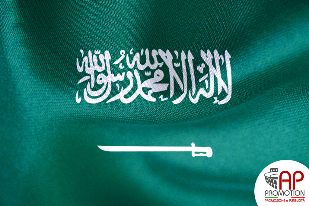 Bandiera nazionale dell'Arabia Saudita, stampata su tessuto 100% poliestere: materiale apposito per l'utilizzo in esterni, ma allo stesso tempo morbido ed esteticamente gradevole per l'utilizzo in ambienti interni. Disponibile in misure standard o personalizzate su richiesta.
