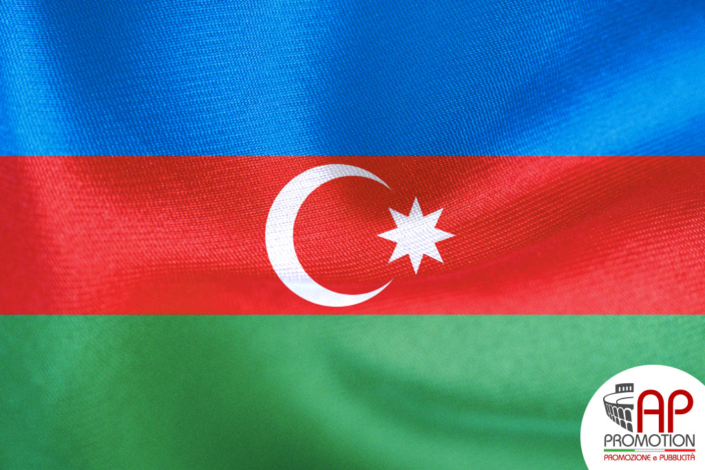 Bandiera nazionale dell'Azerbaigian, stampata su tessuto 100% poliestere: materiale apposito per l'utilizzo in esterni, ma allo stesso tempo morbido ed esteticamente gradevole per l'utilizzo in ambienti interni. Disponibile in misure standard o personalizzate su richiesta.