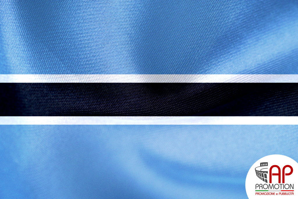 Bandiera nazionale del Botswana, stampata su tessuto 100% poliestere: materiale apposito per l'utilizzo in esterni, ma allo stesso tempo morbido ed esteticamente gradevole per l'utilizzo in ambienti interni. Disponibile in misure standard o personalizzate su richiesta.