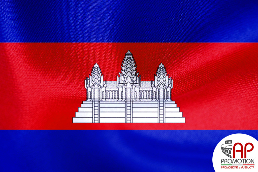 Bandiera Cambogiana disponibile in diversi tessuti e finiture, idonea per esterno. Cuciture doppie, fettuccia di rinforzo lato asta dove prevista, misure standard o personalizzate su richiesta.