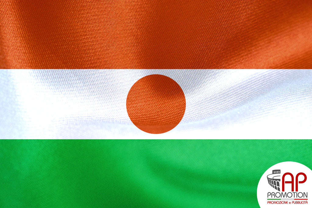 Bandiera nazionale del Niger, stampata su tessuto 100% poliestere: materiale apposito per l'utilizzo in esterni, ma allo stesso tempo morbido ed esteticamente gradevole per l'utilizzo in ambienti interni. Disponibile in misure standard o personalizzate su richiesta.