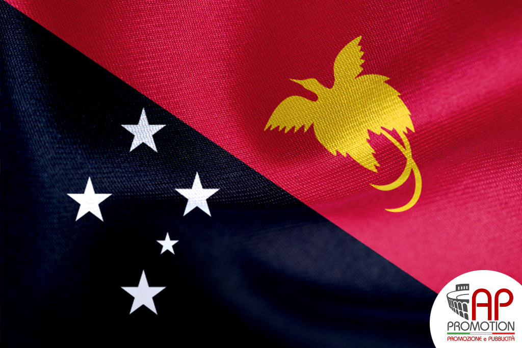 Bandiera nazionale di Papua Nuova Guinea, stampata su tessuto 100% poliestere: materiale apposito per l'utilizzo in esterni, ma allo stesso tempo morbido ed esteticamente gradevole per l'utilizzo in ambienti interni. Disponibile in misure standard o personalizzate su richiesta.