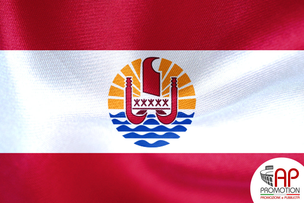 Bandiera nazionale della Polinesia Francese, stampata su tessuto 100% poliestere: materiale apposito per l'utilizzo in esterni, ma allo stesso tempo morbido ed esteticamente gradevole per l'utilizzo in ambienti interni. Disponibile in misure standard o personalizzate su richiesta.