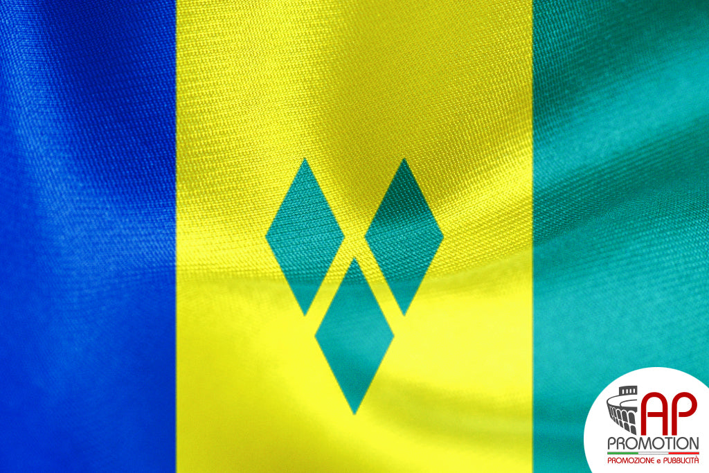 Bandiera nazionale di Saint Vincent e Grenadine, stampata su tessuto 100% poliestere: materiale apposito per l'utilizzo in esterni, ma allo stesso tempo morbido ed esteticamente gradevole per l'utilizzo in ambienti interni. Disponibile in misure standard o personalizzate su richiesta.