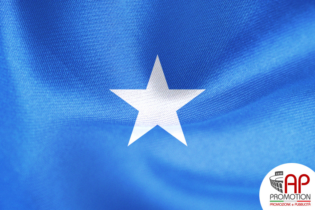 Bandiera nazionale della Somalia, stampata su tessuto 100% poliestere: materiale apposito per l'utilizzo in esterni, ma allo stesso tempo morbido ed esteticamente gradevole per l'utilizzo in ambienti interni. Disponibile in misure standard o personalizzate su richiesta.