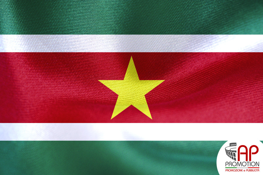Bandiera nazionale del Suriname, stampata su tessuto 100% poliestere: materiale apposito per l'utilizzo in esterni, ma allo stesso tempo morbido ed esteticamente gradevole per l'utilizzo in ambienti interni. Disponibile in misure standard o personalizzate su richiesta.