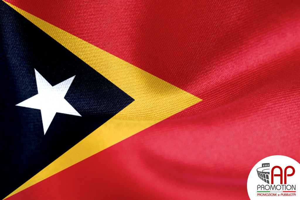 Bandiera nazionale di Timor Est, stampata su tessuto 100% poliestere: materiale apposito per l'utilizzo in esterni, ma allo stesso tempo morbido ed esteticamente gradevole per l'utilizzo in ambienti interni. Disponibile in misure standard o personalizzate su richiesta.