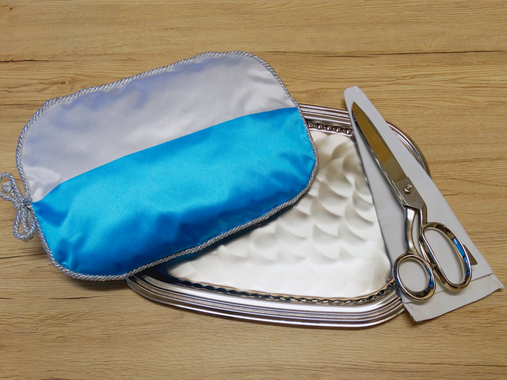 Kit taglio nastro completo: forbice color argento, cuscino personalizzabile, vassoio argentato, custodia e valigetta protettiva.