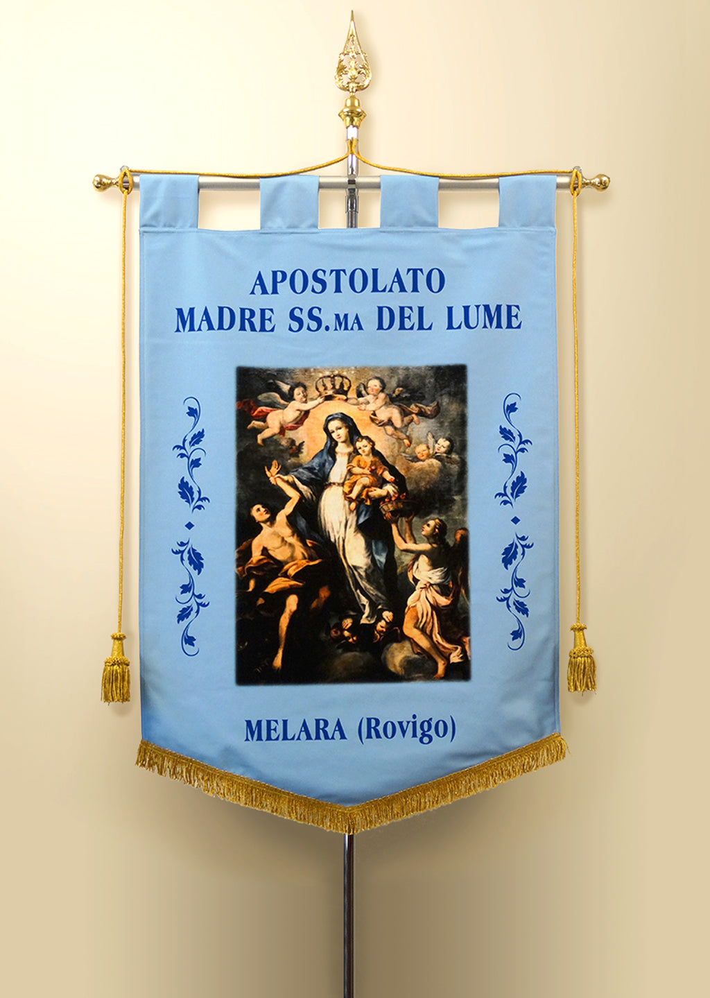 I nostri labari sono rifiniti con passamaneria lungo tutto il perimetro, con una frangia applicata al fondo. Forniamo una cordoniera su misura, abbinata alla passamaneria, completa di fiocchi terminali in canuttiglia. Le finiture sono disponibili nei colori oro o argento.