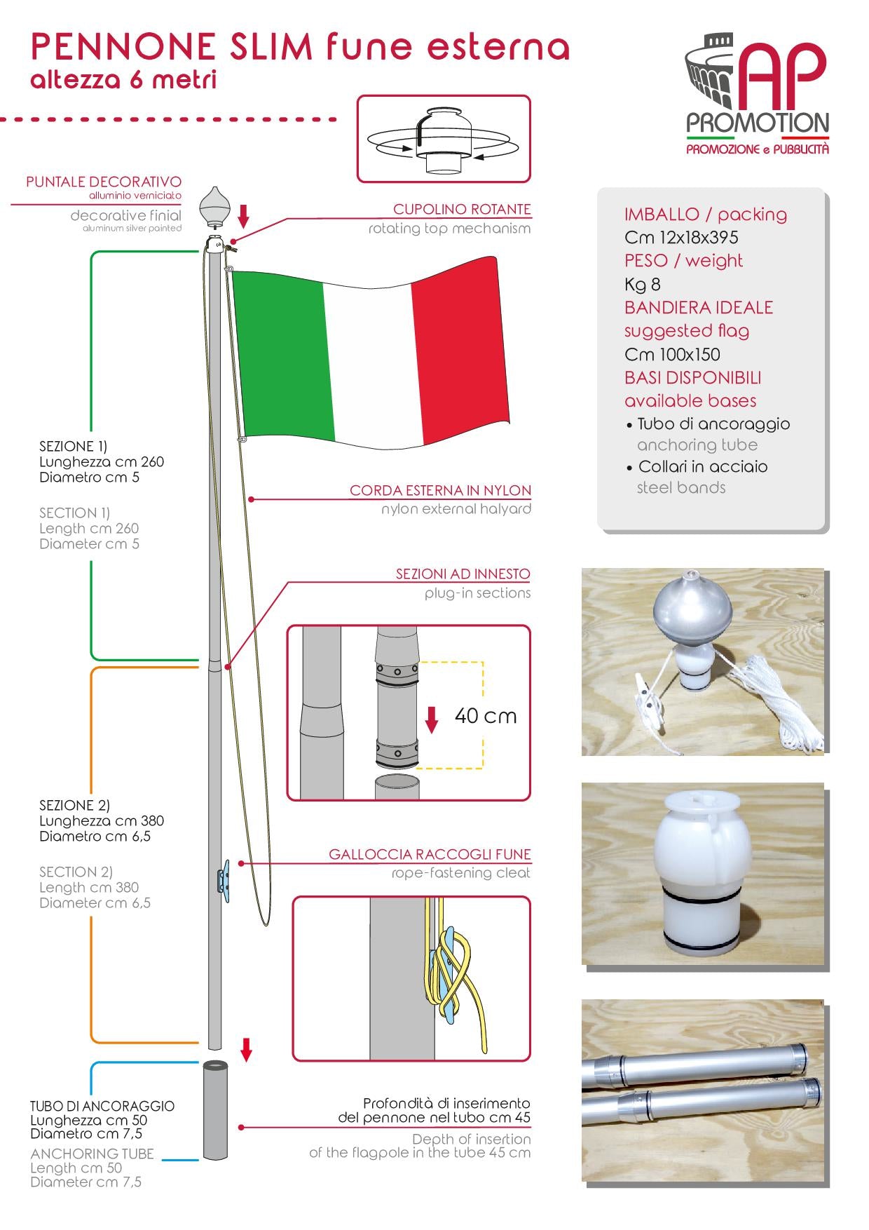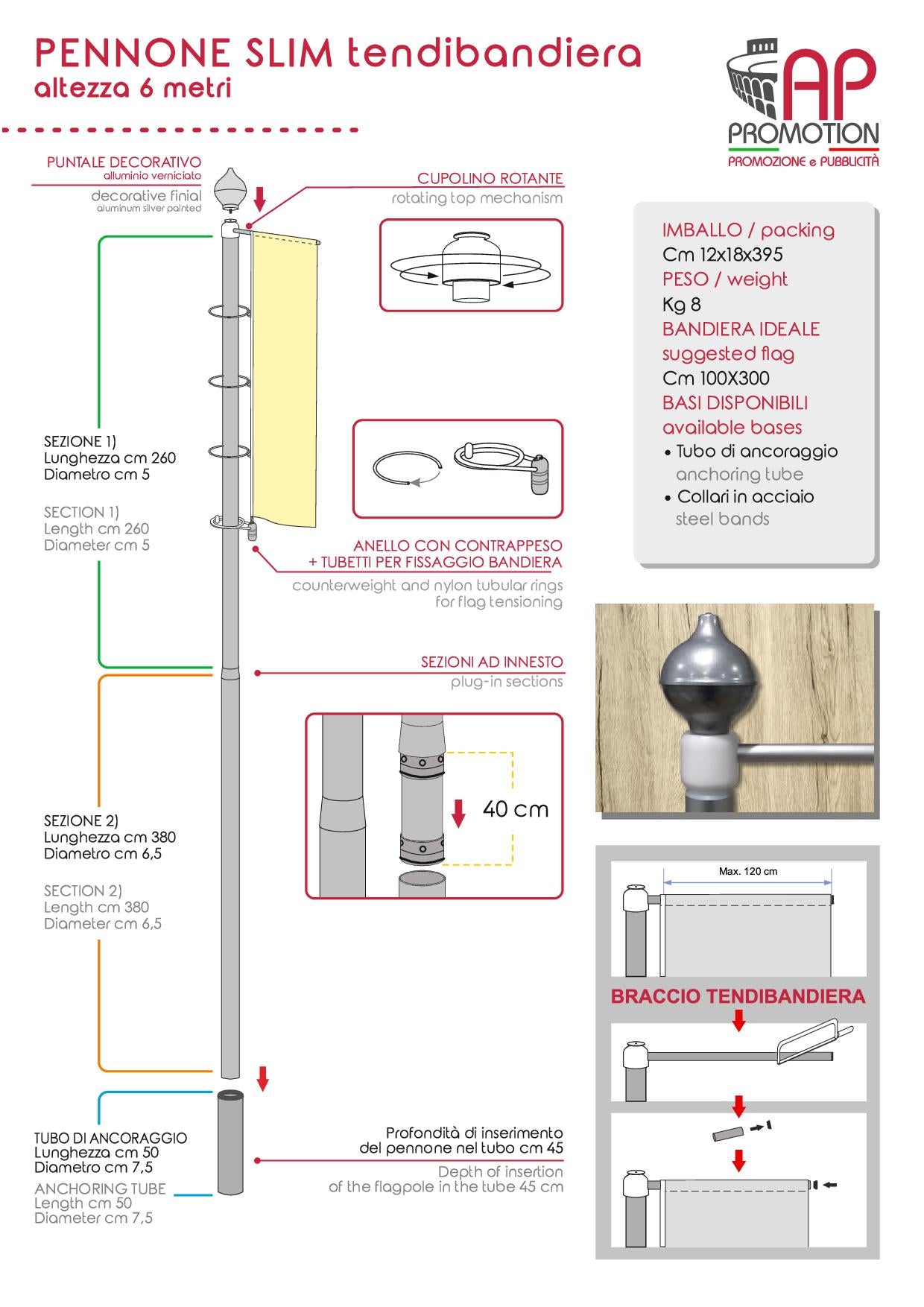Il Pennone Slim rappresenta la soluzione più economica e versatile della nostra gamma, ideale per installazioni standard e budget contenuti. Disponibile in due varianti:
