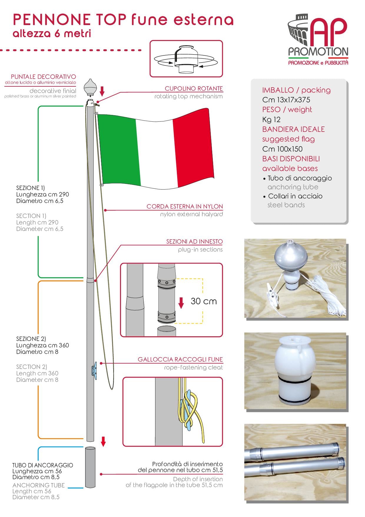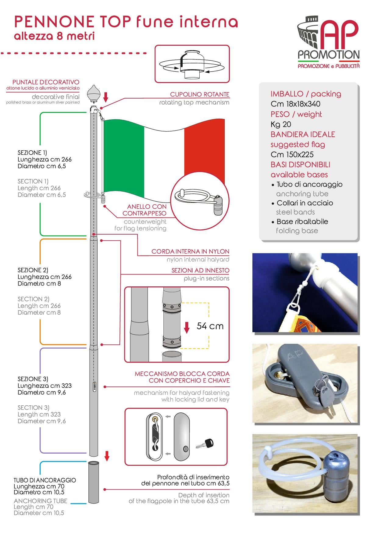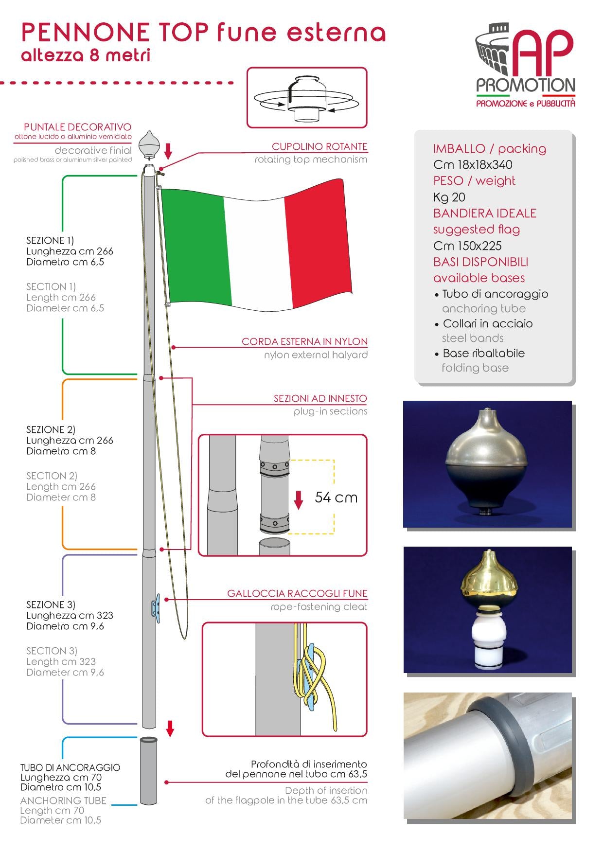 Tutti i nostri pennoni sono realizzati utilizzando alluminio di grado aeronautico e componenti in acciaio inox di alta qualità, materiali che garantiscono: