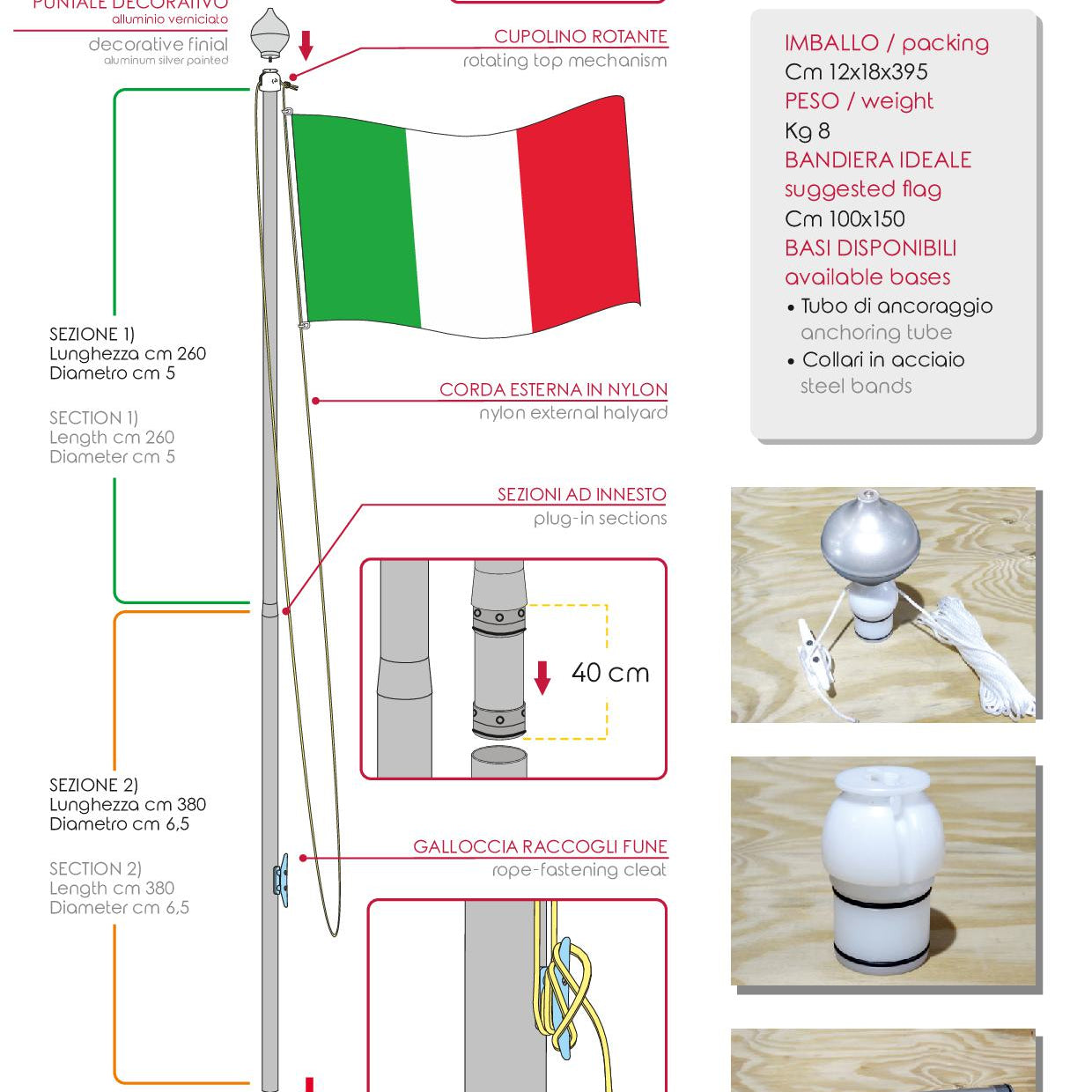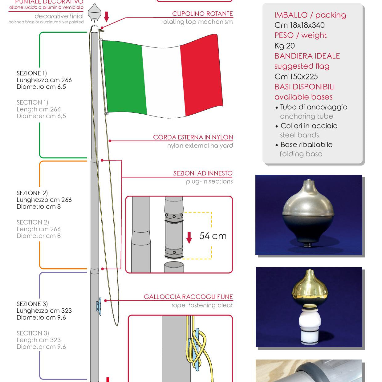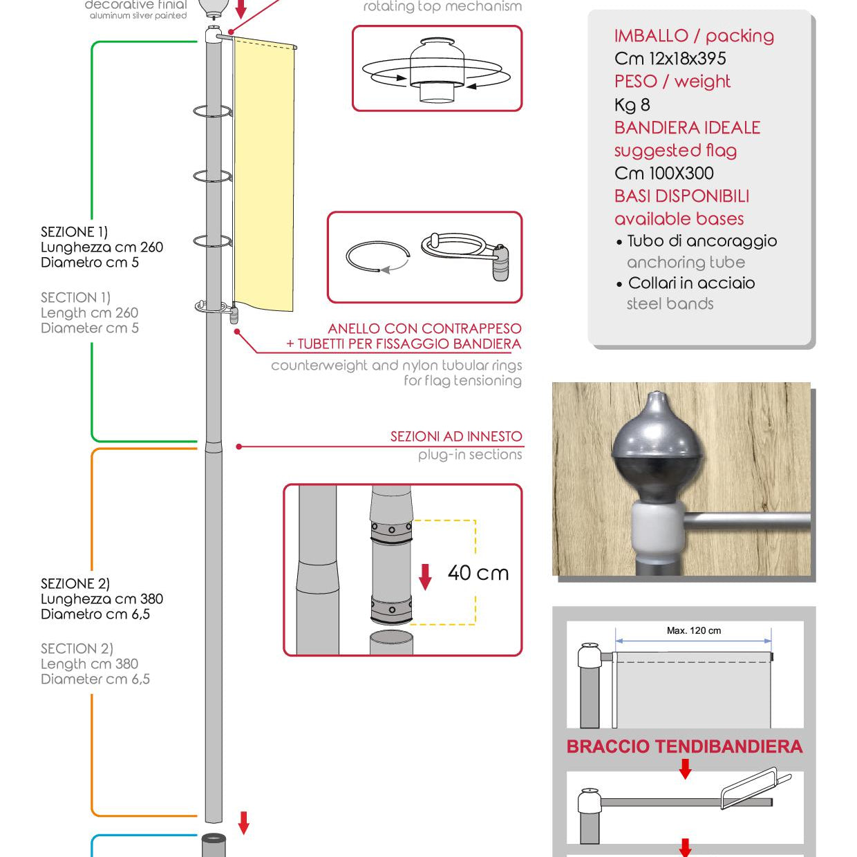 - Con braccio tendibandiera orizzontale per una visibilità ottimale della bandiera in ogni condizione atmosferica