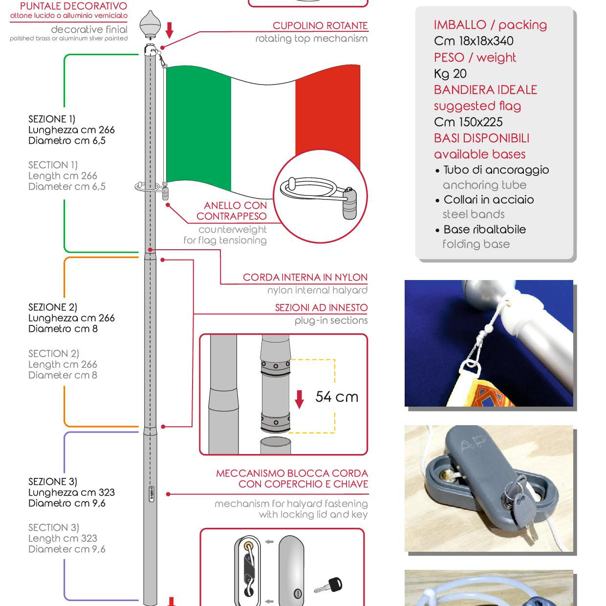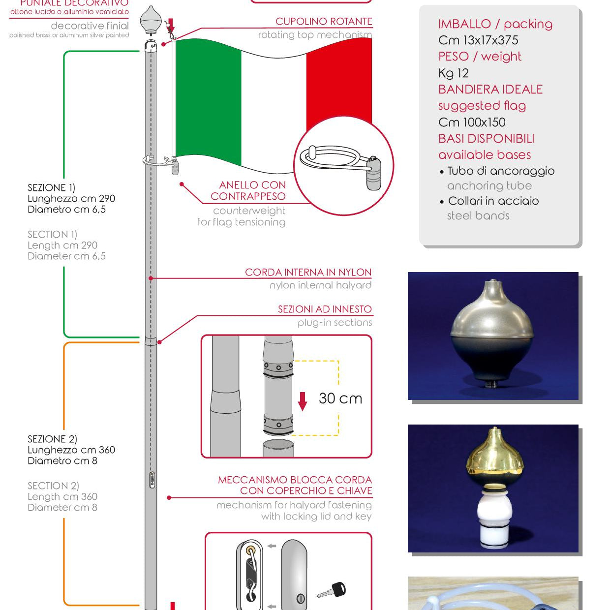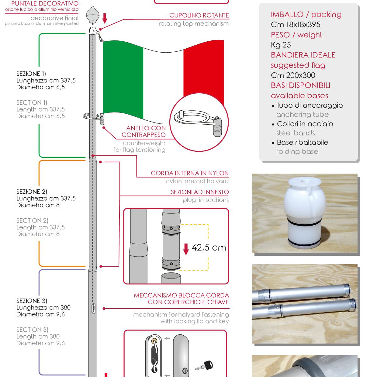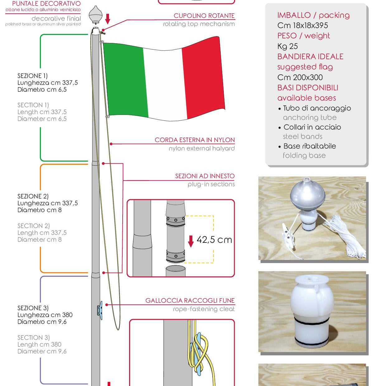 - Con braccio tendibandiera orizzontale per una visibilità ottimale della bandiera in ogni condizione atmosferica
