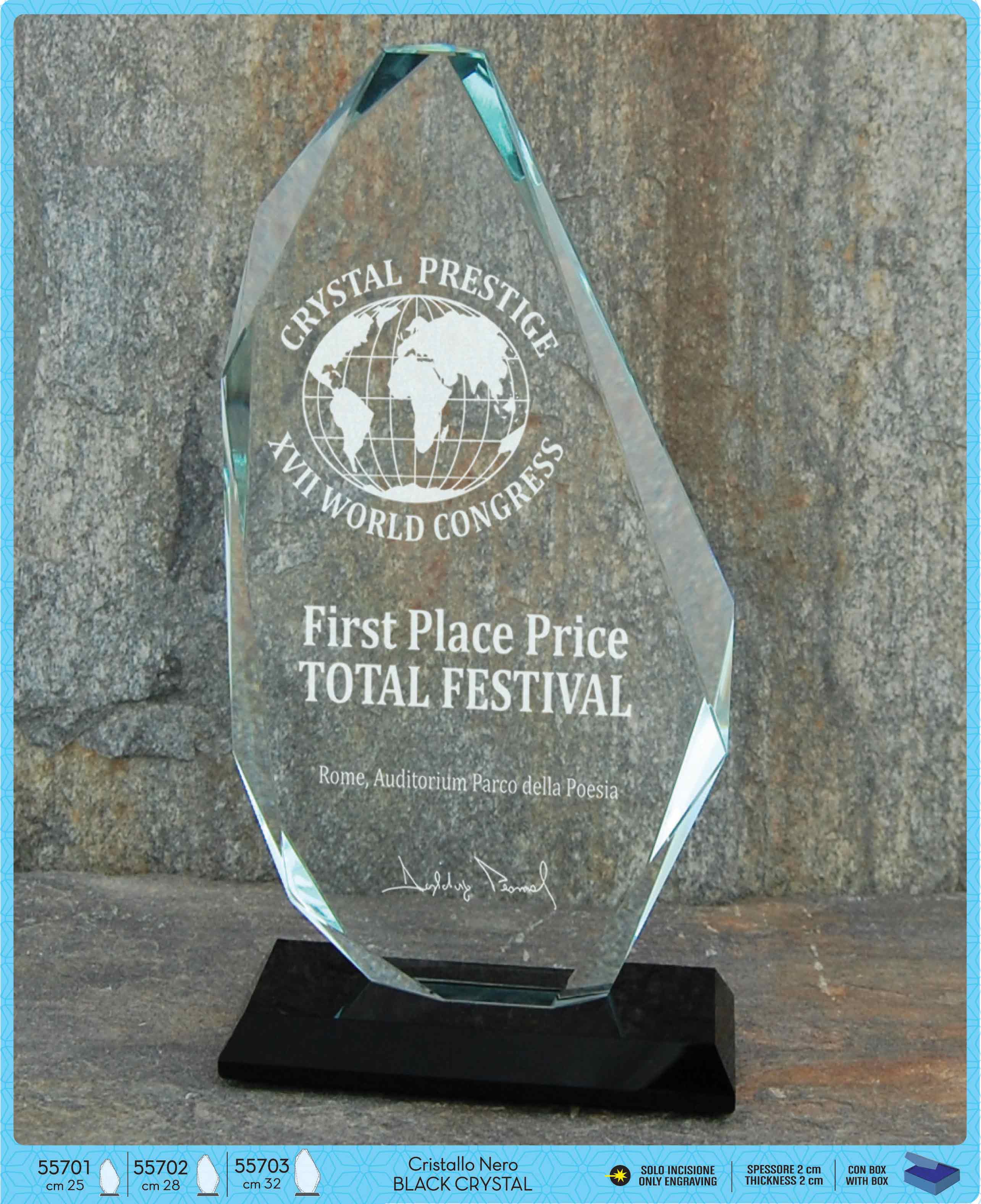 Premio interamente realizzato in cristallo con elegante sagomatura asimmetrica e angoli smussati, basetta in cristallo nero. Spessore 20 mm.