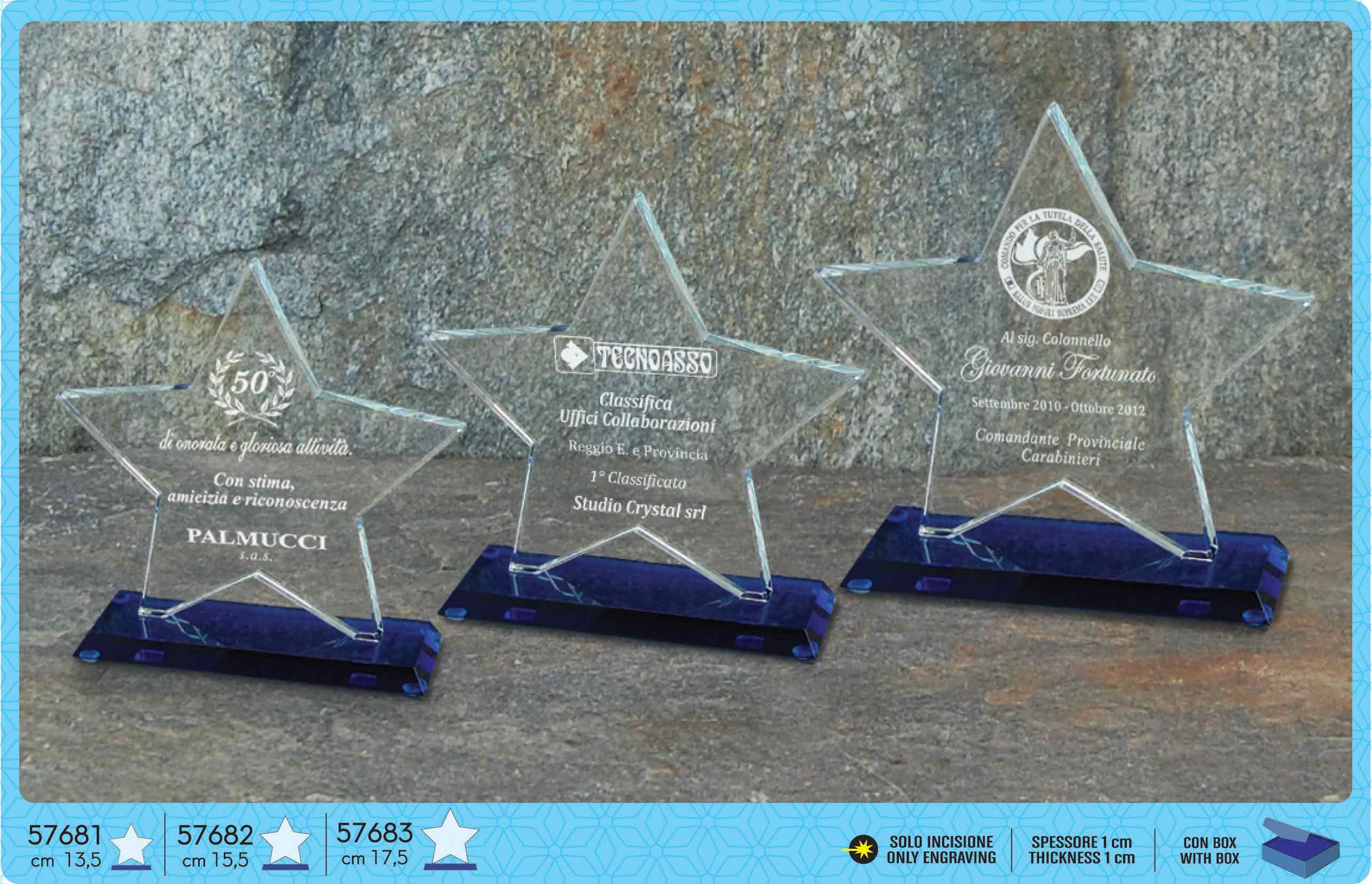 Premio interamente realizzato in cristallo a forma di stella, con base in cristallo blu. Spessore mm 10.