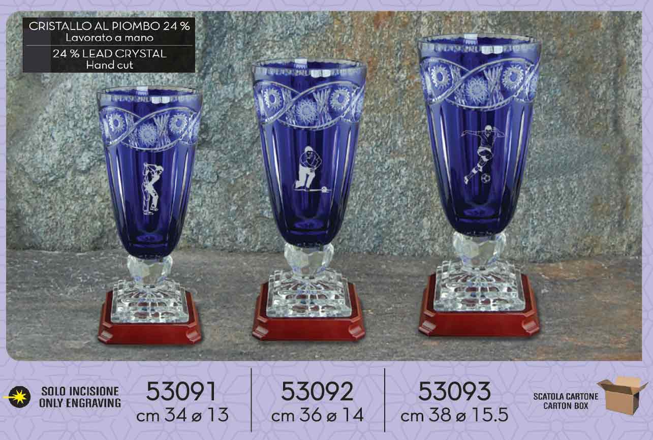 Trofeo in cristallo al piombo 24% colore blu lavorato a mano con basetta in legno. Personalizzabile con incisione a laser nella parte superiore.