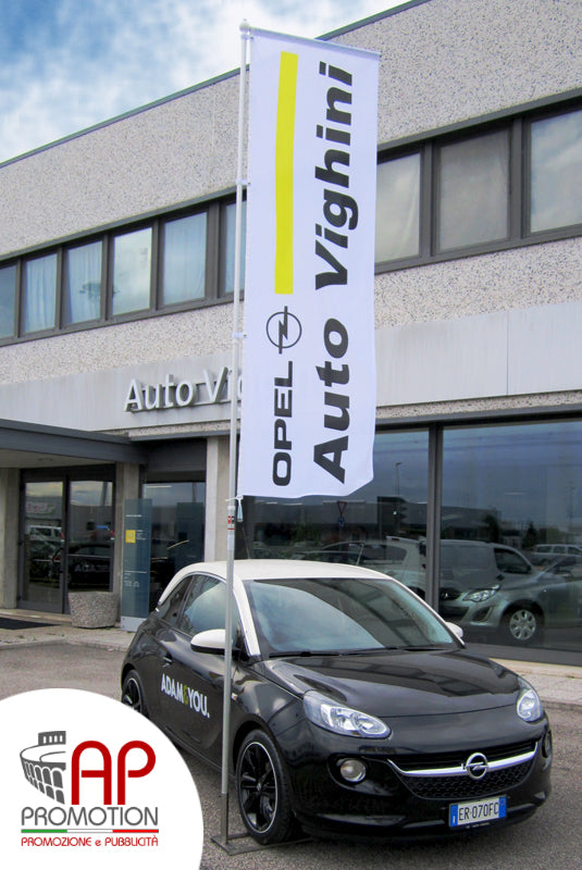 - Bandiere verticali: dotate di braccio tendibandiera o banner non issabile, ideale per visibilità costante anche in assenza di vento. Le bandiere verticali sono confezionate con tasca superiore per banner, cintino di rinforzo a sinistra, fasce con bottone automatico e moschettone inferiore per il contrappeso. Misura ideale: 90x300 cm con asta completamente estesa.