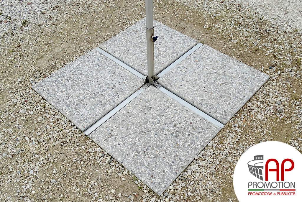 - Base a croce zavorrabile: in acciaio verniciato grigio micaceo per piastre 50x50 cm in cemento con finitura ghiaino lavato (~20 kg cad.; piastre escluse). Misura: 105x105 cm.