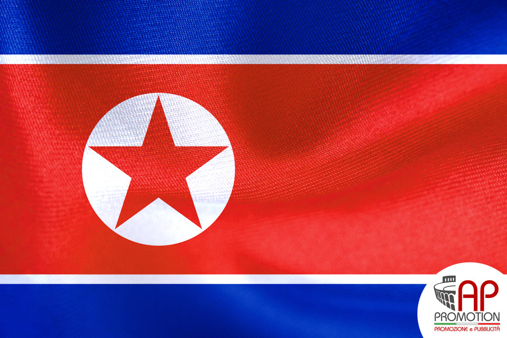 Bandiera nazionale della Corea del Nord, stampata su tessuto 100% poliestere: materiale apposito per l'utilizzo in esterni, ma allo stesso tempo morbido ed esteticamente gradevole per l'utilizzo in ambienti interni. Disponibile in misure standard o personalizzate su richiesta.