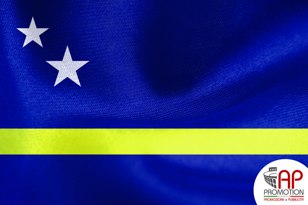 Bandiera di Curaçao disponibile in diversi tessuti e finiture, idonea per esterno. Cuciture doppie, fettuccia di rinforzo lato asta dove prevista, misure standard o personalizzate su richiesta.