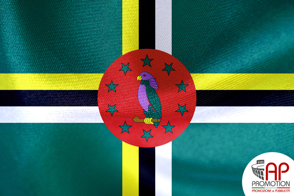 Bandiera nazionale della Dominica, stampata su tessuto 100% poliestere: materiale apposito per l'utilizzo in esterni, ma allo stesso tempo morbido ed esteticamente gradevole per l'utilizzo in ambienti interni. Disponibile in misure standard o personalizzate su richiesta.