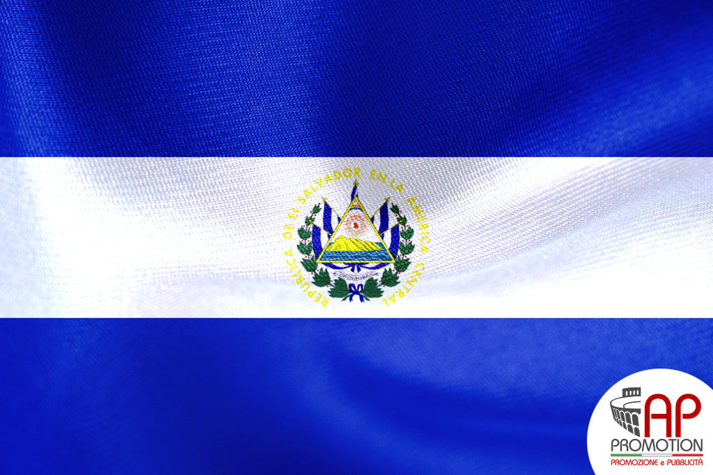 Bandiera nazionale di El Salvador, stampata su tessuto 100% poliestere: materiale apposito per l'utilizzo in esterni, ma allo stesso tempo morbido ed esteticamente gradevole per l'utilizzo in ambienti interni. Disponibile in misure standard o personalizzate su richiesta.