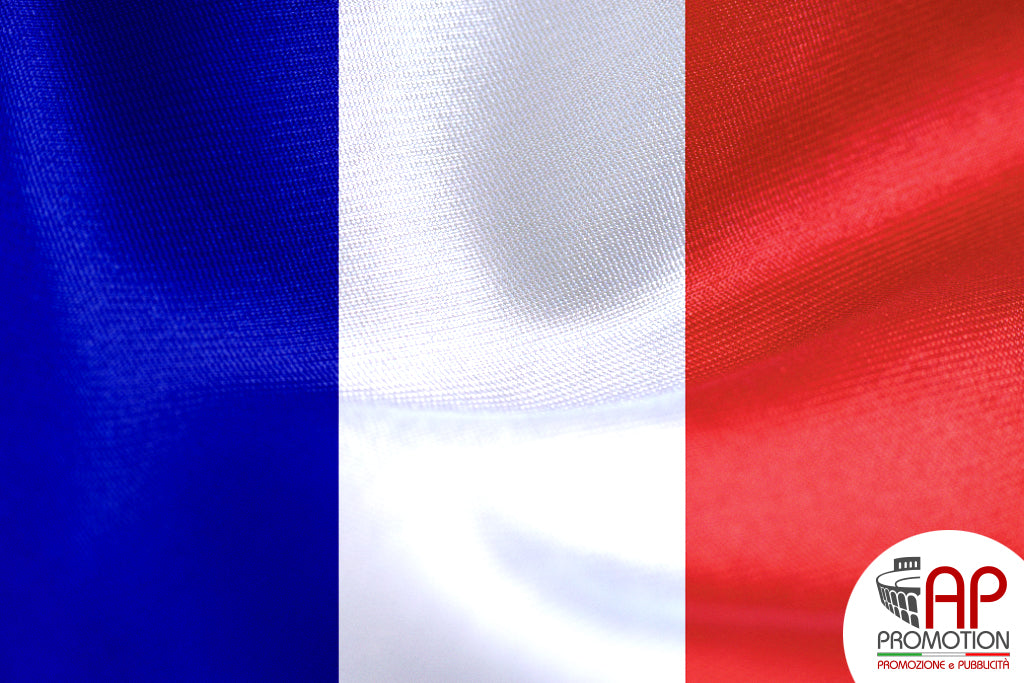 Bandiera nazionale della Francia, stampata su tessuto 100% poliestere: materiale apposito per l'utilizzo in esterni, ma allo stesso tempo morbido ed esteticamente gradevole per l'utilizzo in ambienti interni. Disponibile in misure standard o personalizzate su richiesta.