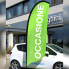 Bandiera pubblicitaria sagomata a piuma, adatta per uso interno ed esterno. Disponibile in varie dimensioni, con basi e accessori.