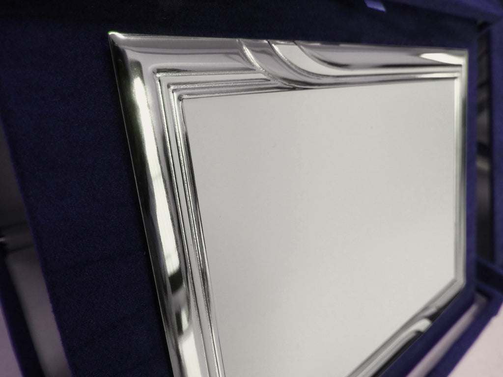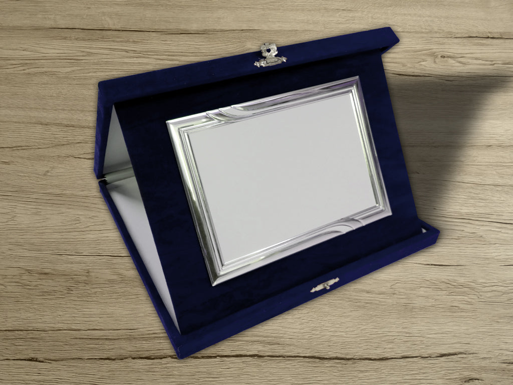 La targa* è in alluminio argento con elegante bordo bombato lucido, decorata con stampa in termografia a colori e applicata sul pannello interno di questo astuccio in velluto blu dal particolare e moderno effetto cuoio.