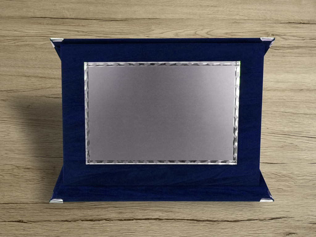 Targa in alluminio con stampa a colori, su bustina pieghevole in velluto blu. Design pratico e raffinato.