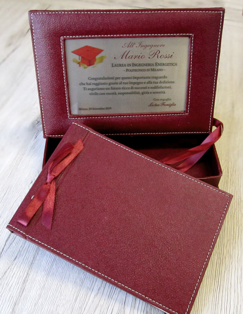 Cofanetto bordeaux con album fotografico 18 fogli, targa in alluminio bronzato satinato e sistema di apertura esposizione.