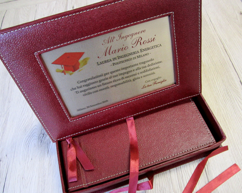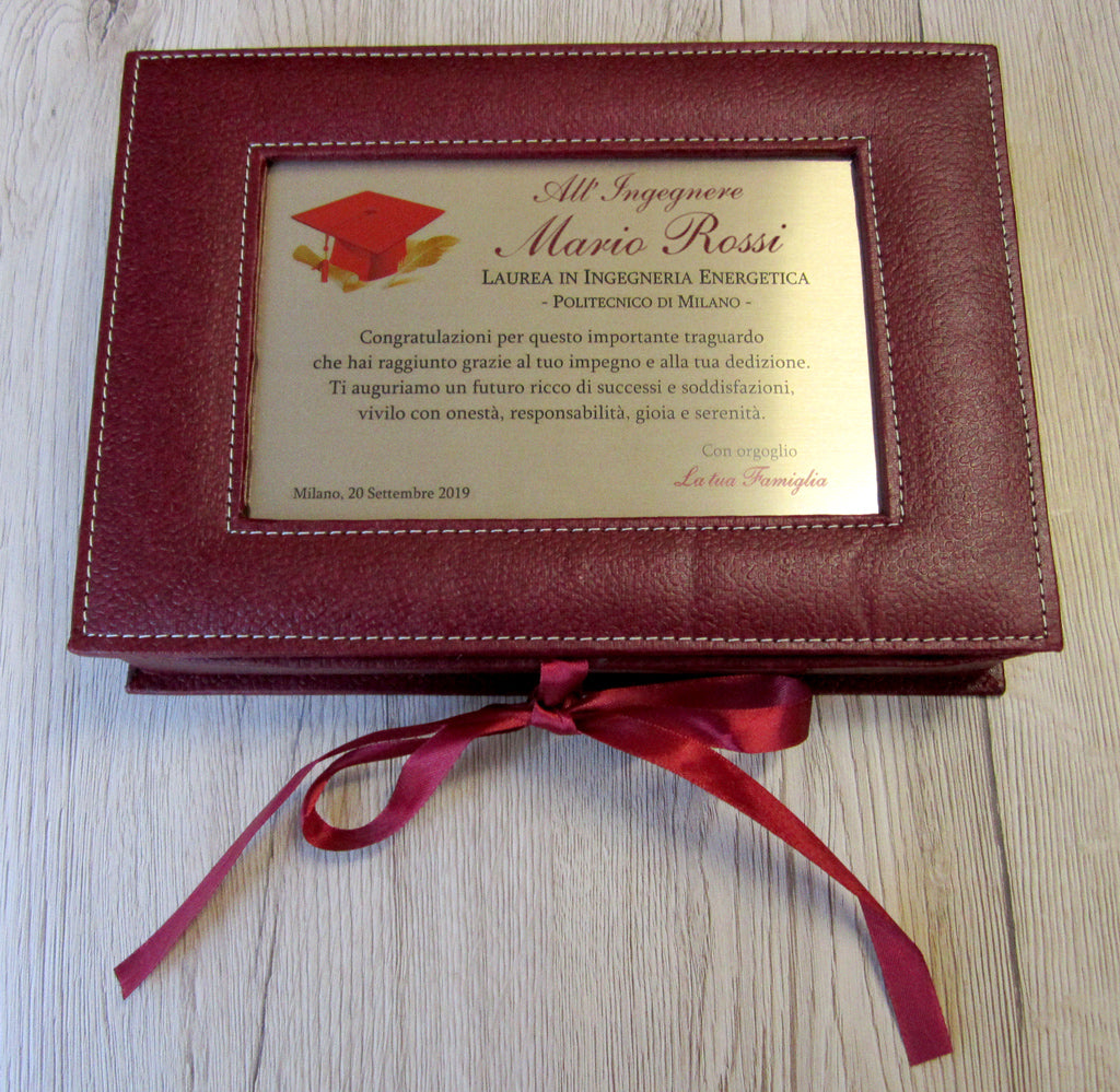 La targa* - inserita nella parte superiore del cofanetto - è in alluminio bronzato satinato, la personalizzazione avviene con stampa in termografia a colori. La superficie della targa consente una stampa ad alta qualità di testi, immagini e fotografie, e ne esalta i colori aggiungendovi in trasparenza un particolare effetto metallizzato, appena riscaldato dalla colorazione bronzata.