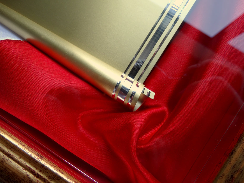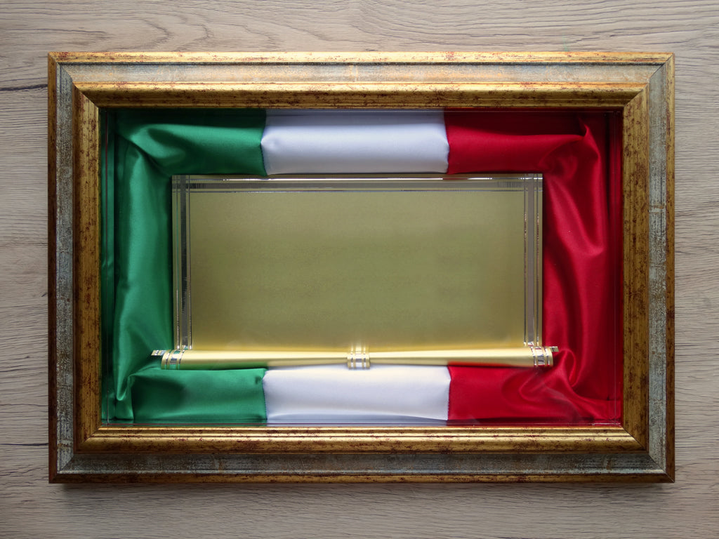La cornice in legno modello Tricolore esalta l'importanza della targa dorata con il suo prezioso fondo in raso bombato Tricolore Italiano.