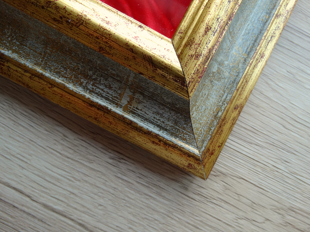 La cornice è semplice e preziosa, con bordo dal taglio classico e laccatura oro / argento con effetto anticato.