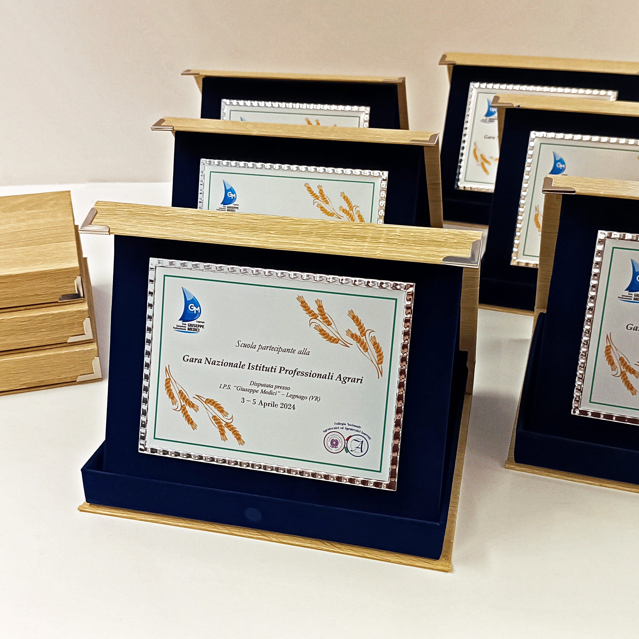 La forma più classica e versatile della targa è il modello da appoggio, confezionato in astucci raffinati che ne valorizzano l’importanza. I nostri astucci sono disponibili in diversi materiali, tra cui: